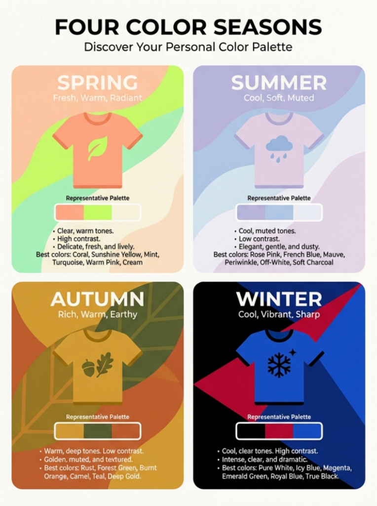 Seasonal colour analysis is a method for determining which colours complement your natural skin, hair, and eye tones. The system groups these features into 4 distinct seasons—spring, summer, autumn, and winter. Wearing colours from your palette can help you look more vibrant and put-together.